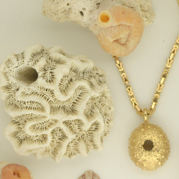 This spectacular Sea Urchin shell comes from a story of perseverance after our many attempts to find and successfully cast into solid gold the perfect shell .